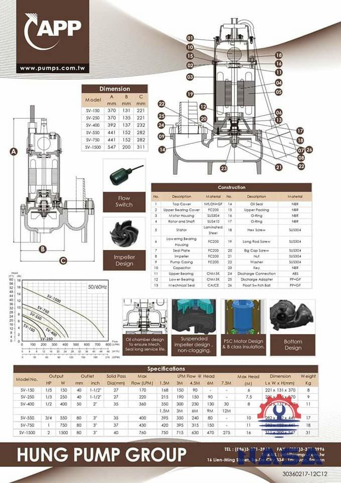 Vật liệu chế tạo máy bơm chìm APP SV-1500A